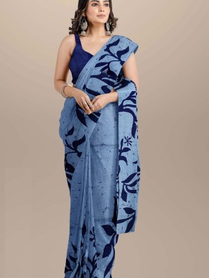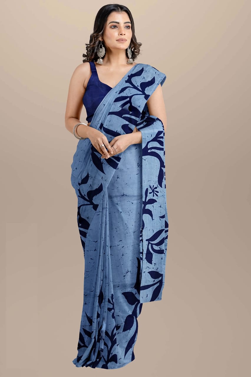 Sky Blue Printed Mulmul Cotton Saree Hand Block Printed with Blouse Piece for Women