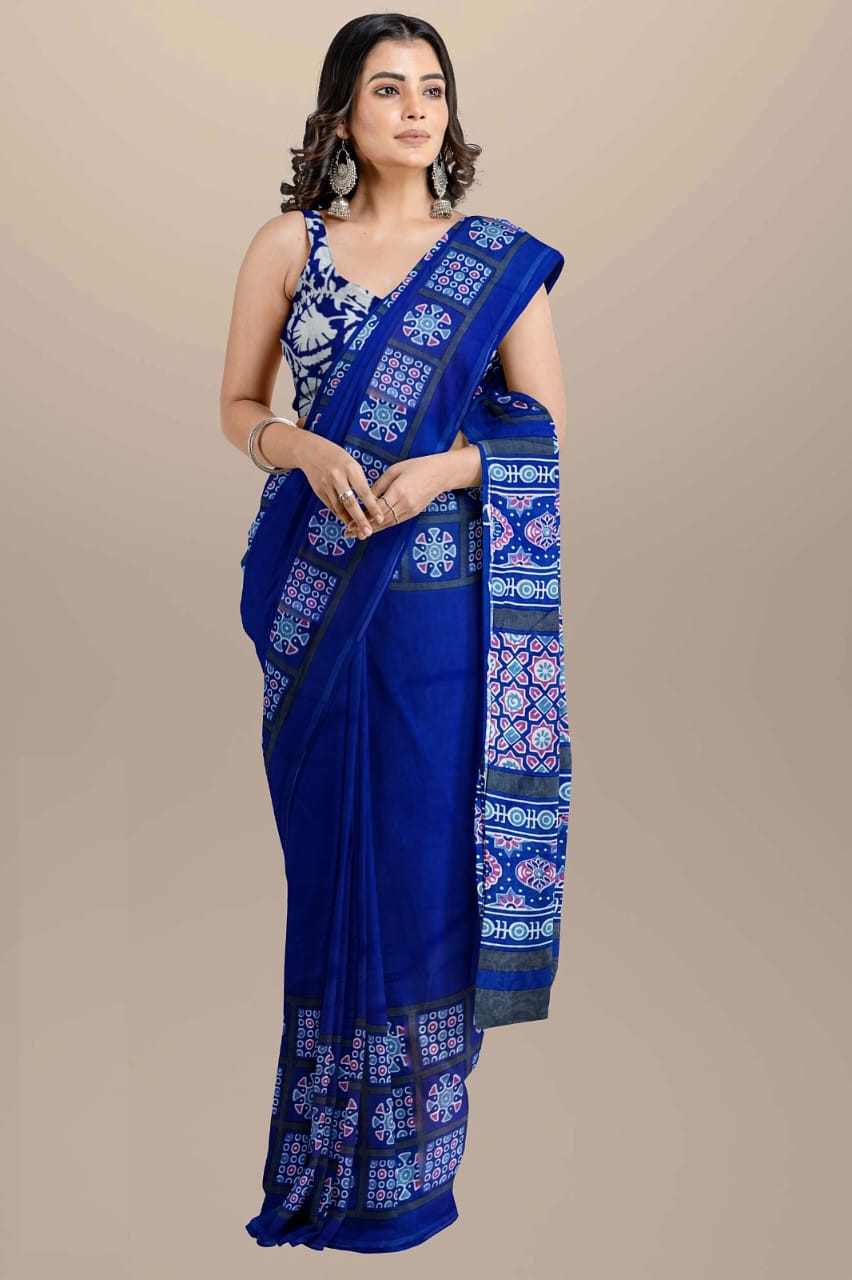 This Pigment hand block printed mulmul cotton saree is crafted with buttery soft and delicately beautiful fabric, making it a breeze to drape. The ancient art of block printing gives rise to vibrant and bold designs that will surely be adored. This is perfect for daily wear in the summers, it offers both comfort and breath ability.