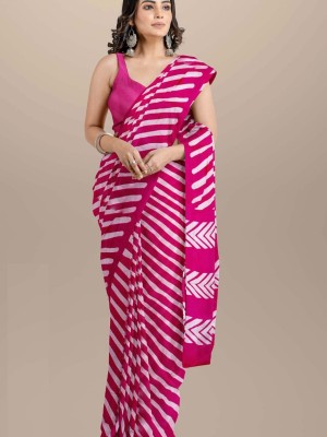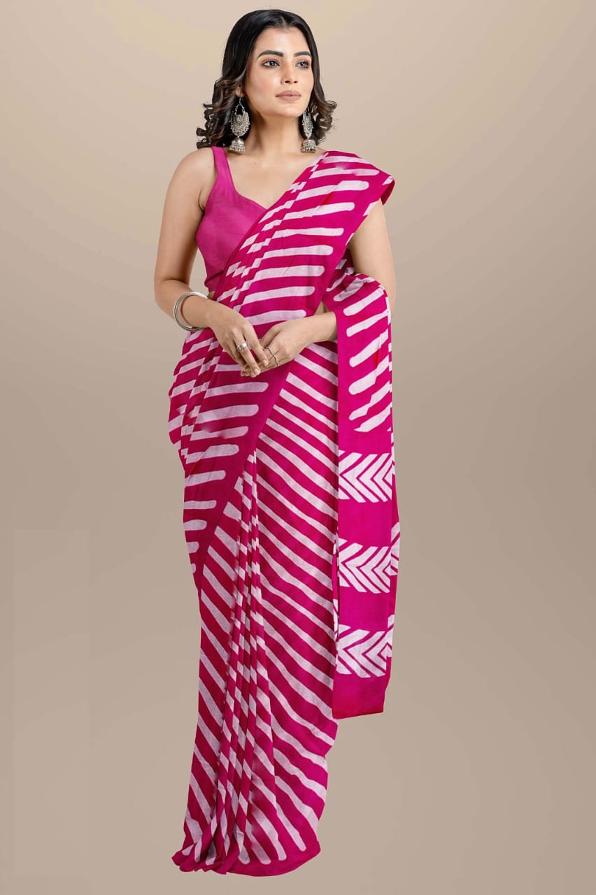 Veena Pink Lehariya Striped Mulmul Cotton Saree Hand Block Printed Gulabi Sadi with Blouse Piece for Women