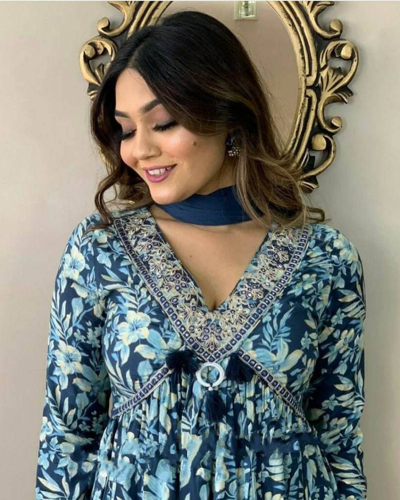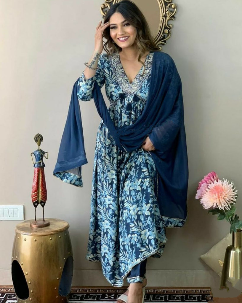 Blue Floral Alia Cut Embroidered Salwar Kameez Kurti Pant Dupatta Suit Set