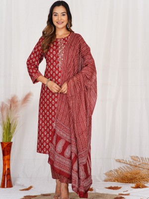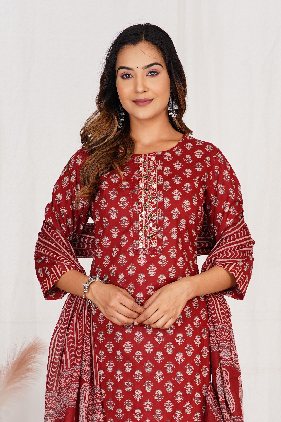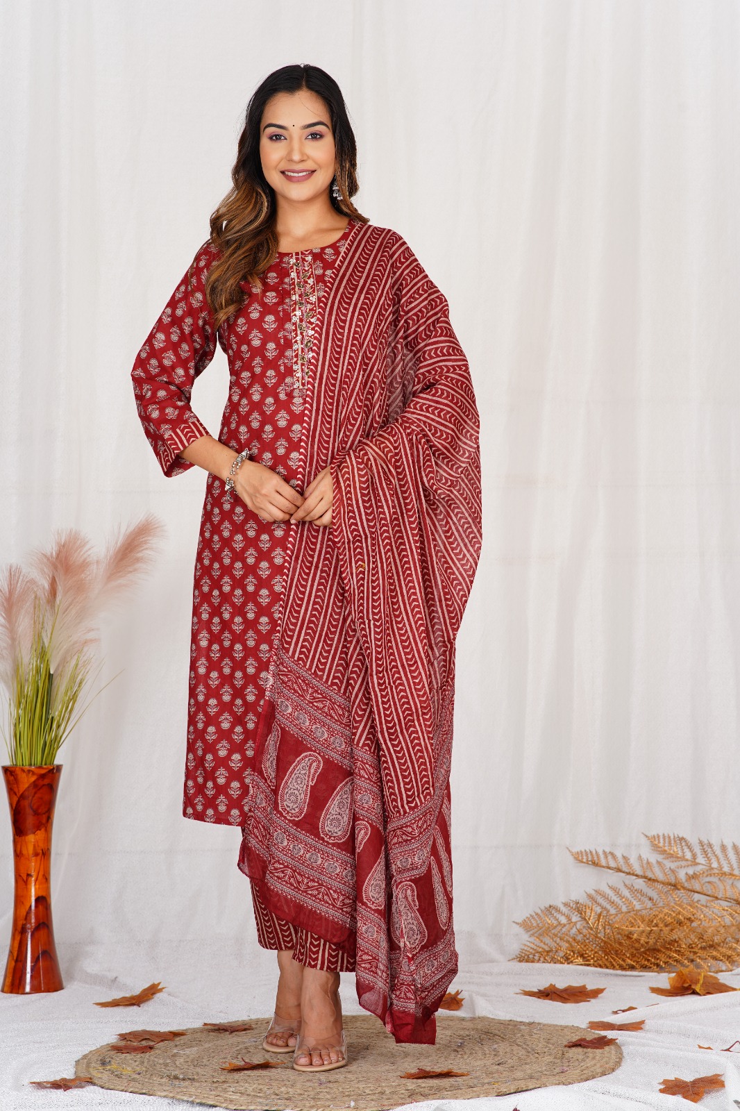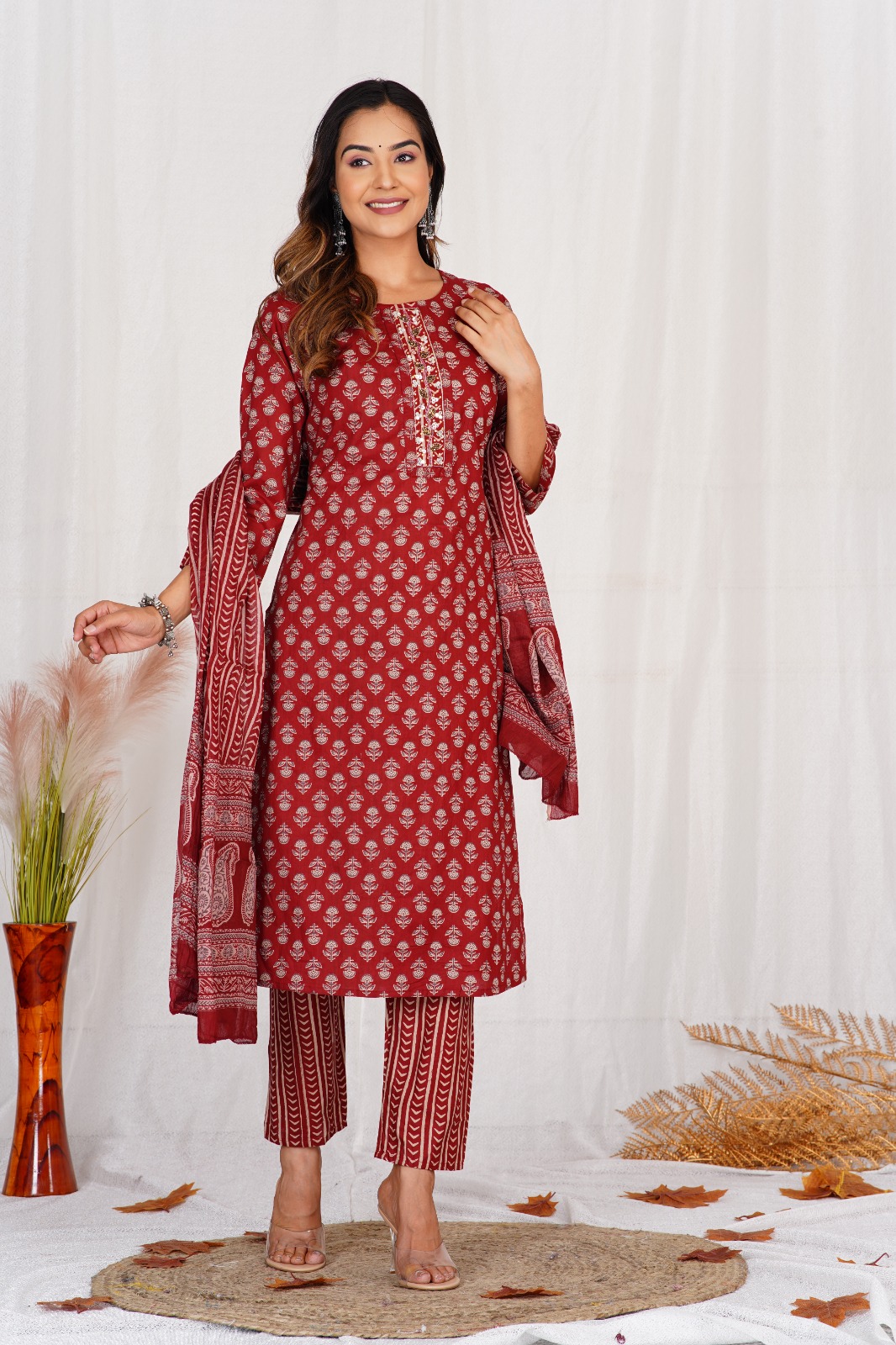 Jiya Maroon Embroidered Kurti Pant Dupatta Traditional Ethnic Cotton Block Print Straight Salwar Kameez Suit Set
