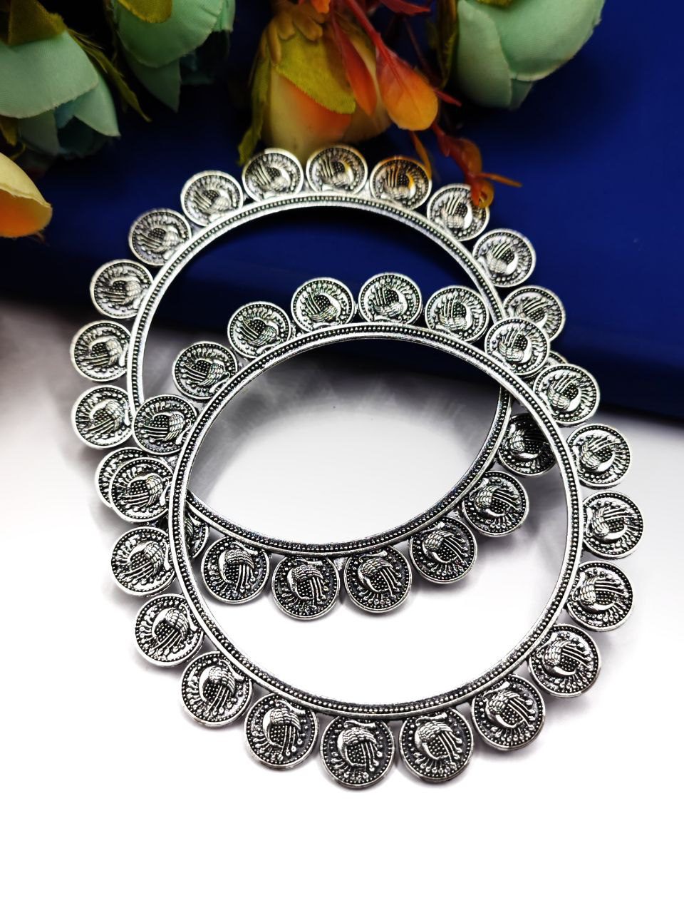 Boho Oxidised German Silver Peacock Coin Bangle Pair For Girls