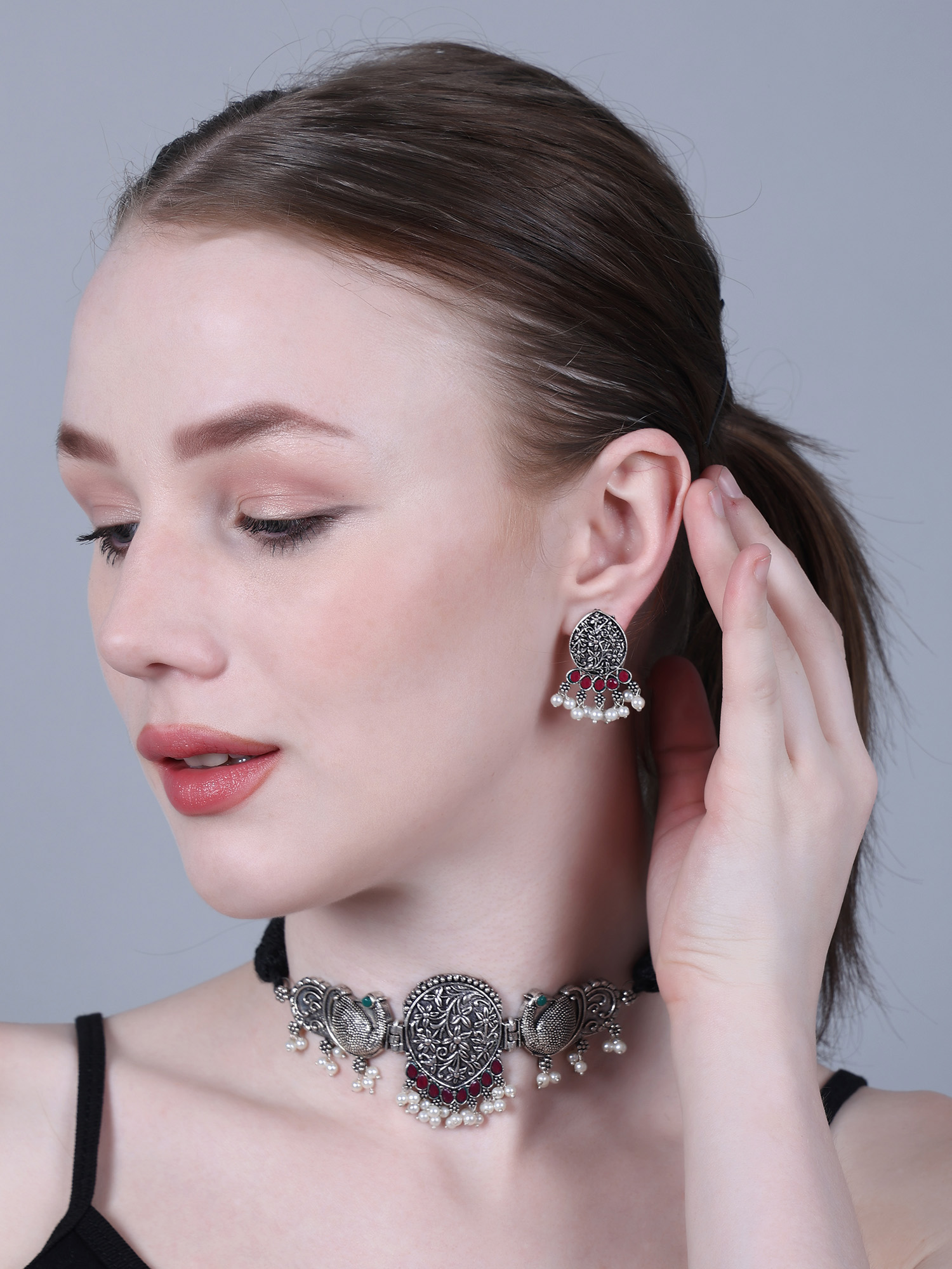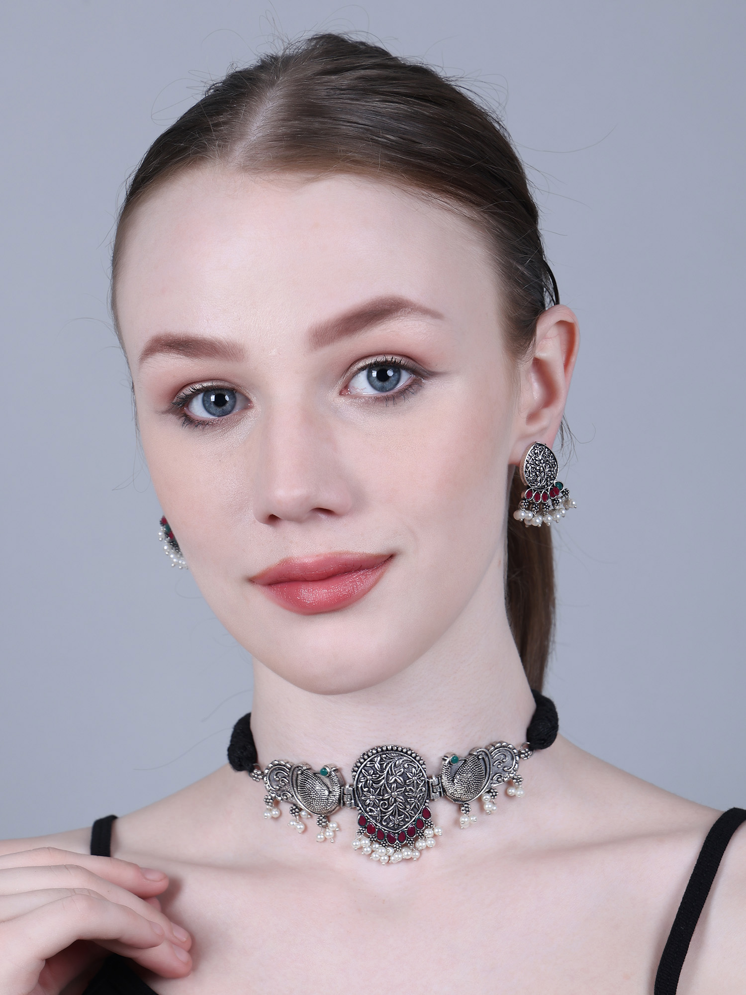 Peacock Oxidised Choker Necklace Earring Jewellery Set