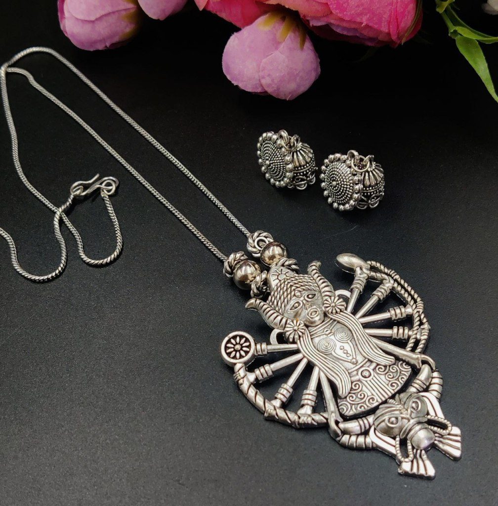 Oxidized Indian Goddess Mataji Pendent Necklace Chain Set with Jhumki for Girls