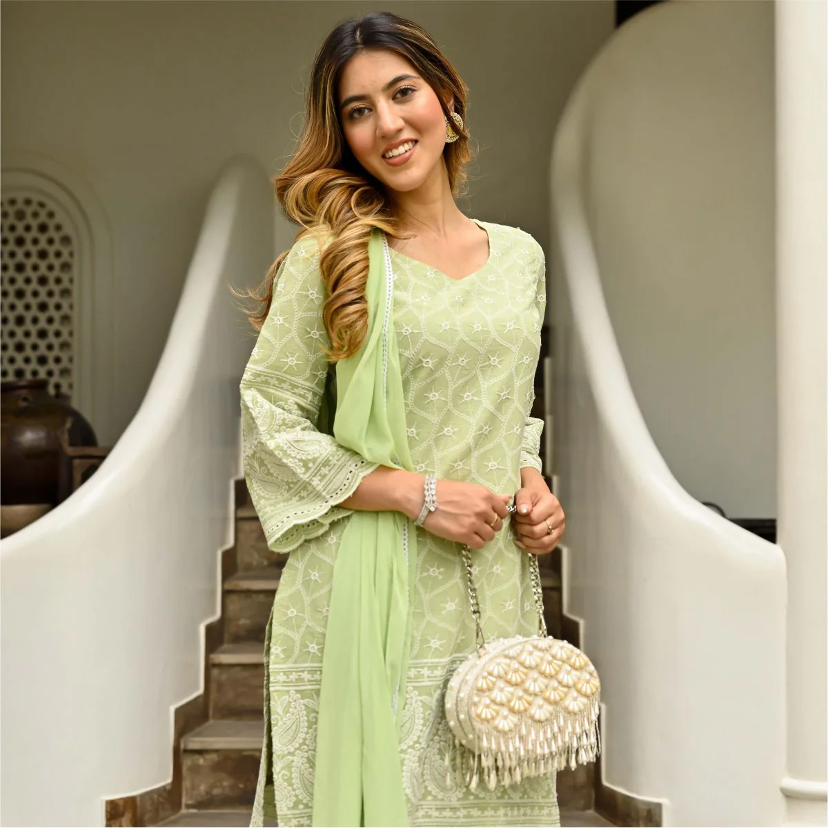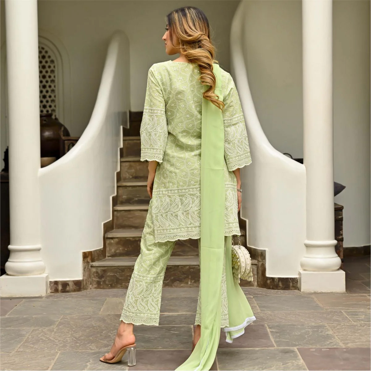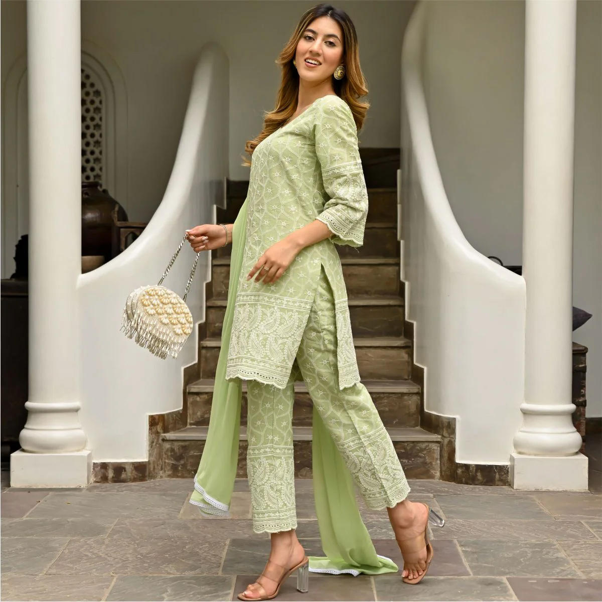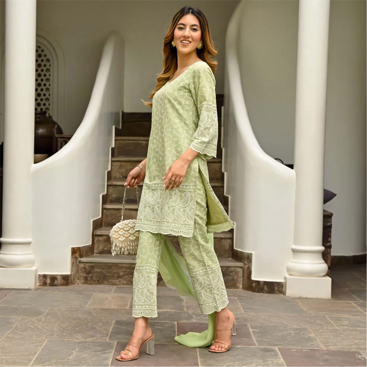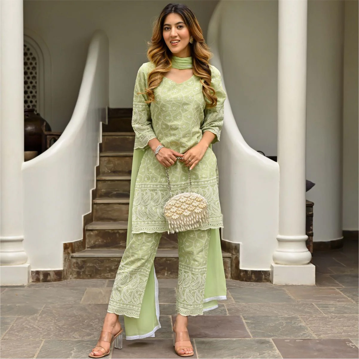 Green Indian Pakistani Women Chikankari Embroidery Kurti Set with Dupatta Salwar Kurta Pant Dress Suit New Set
