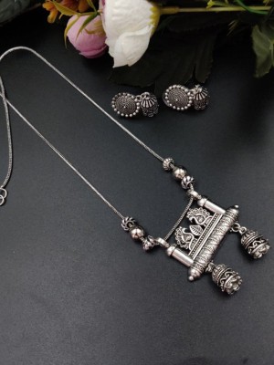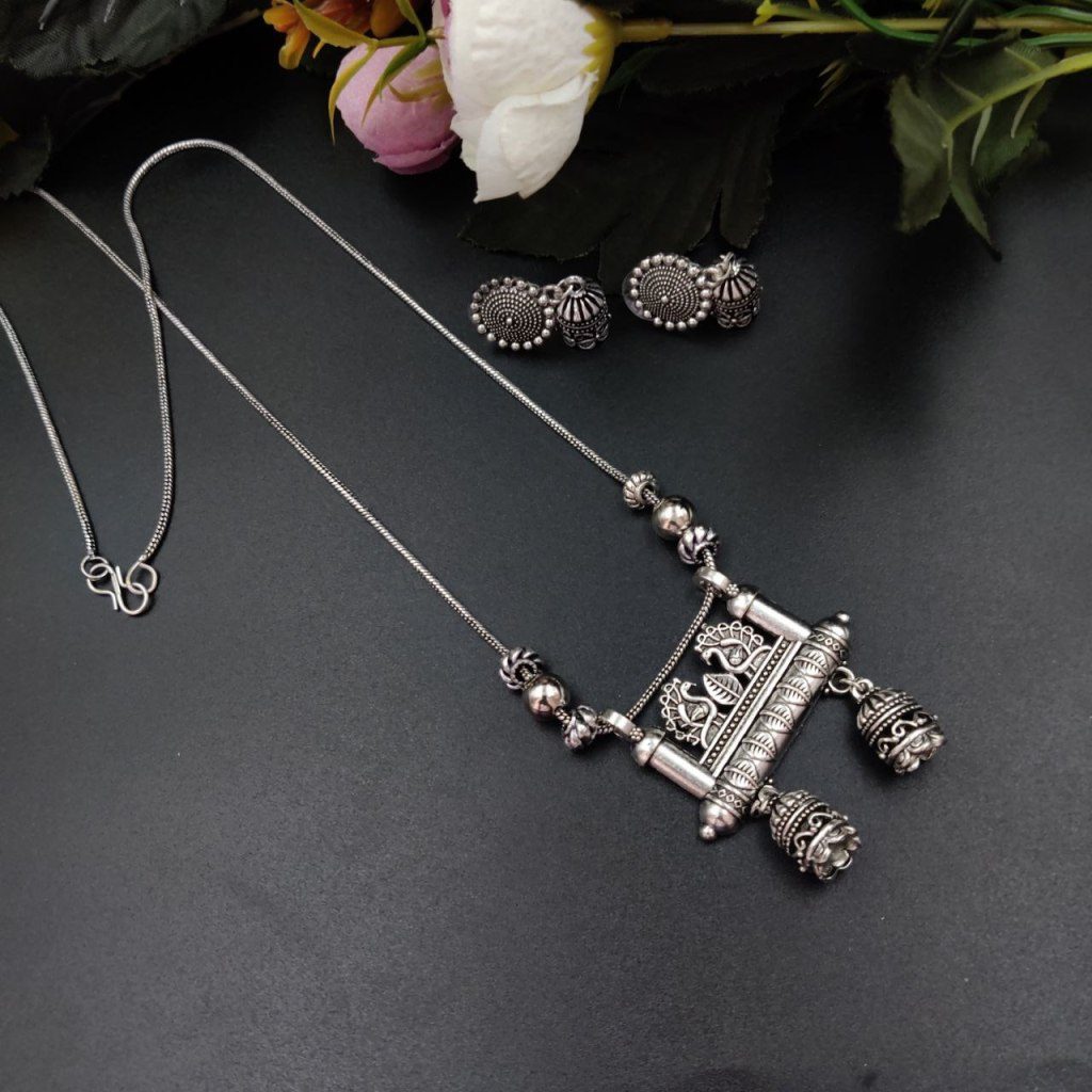 Bohemian Banjara Style Rajasthani Pendent Silver Oxidized Necklace Chain Set with Jhumki
