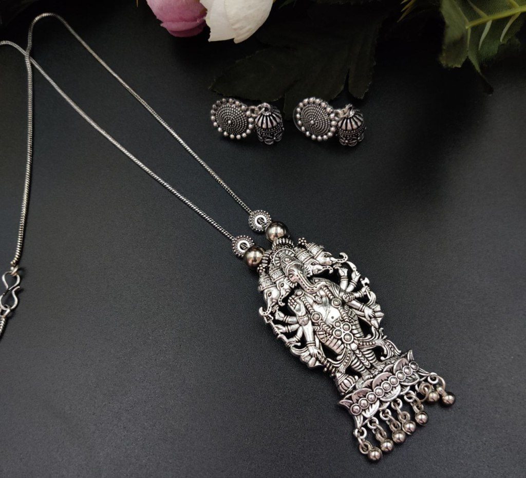 Indian Hindu Lord Ganesha Pendent Silver Oxidized Necklace Chain Set with Jhumki