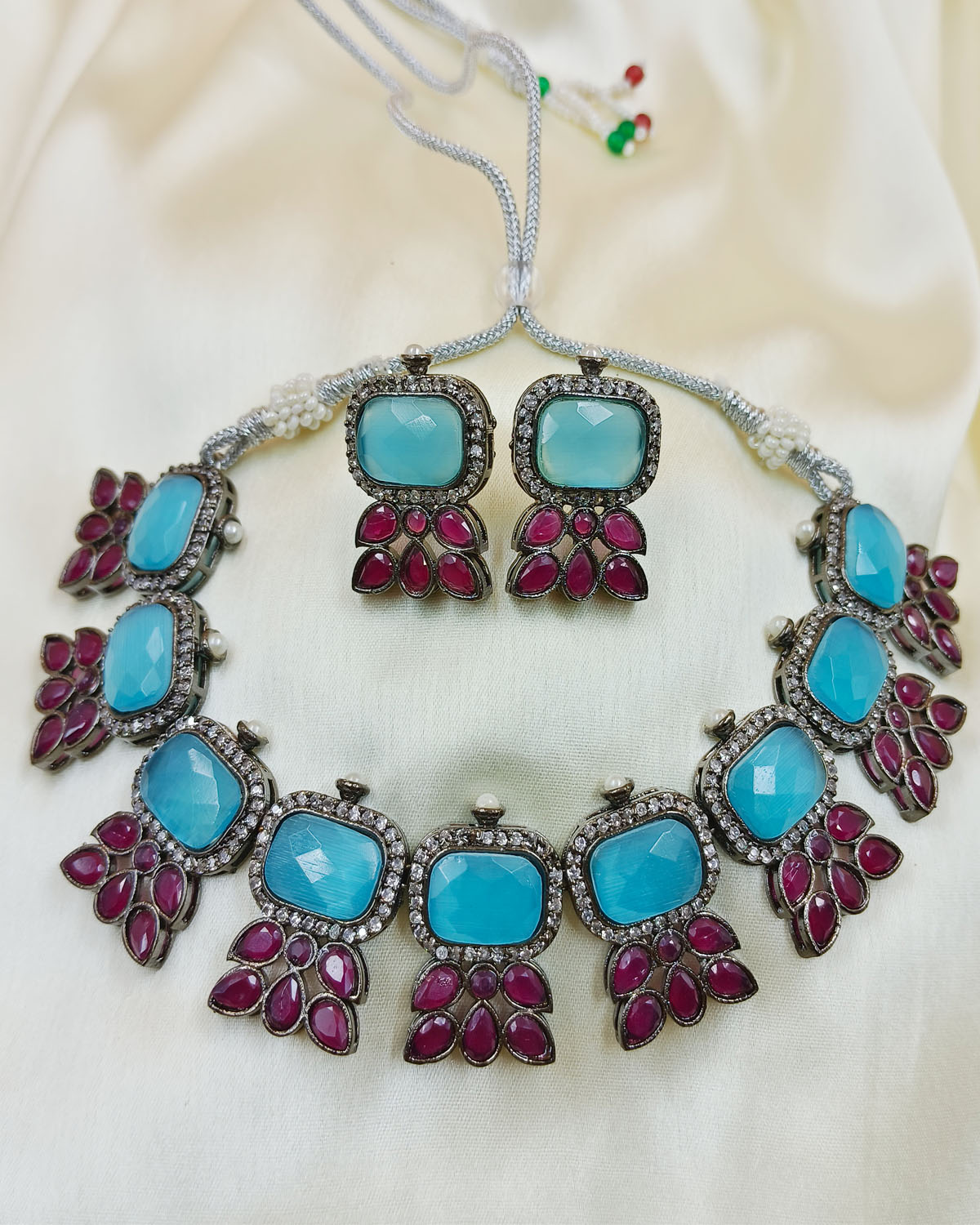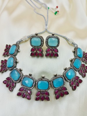 Turquoise Blue AD Stone Choker Necklace Earring Set Adjustable High Neck American Diamond Monalisa Stone Necklaces