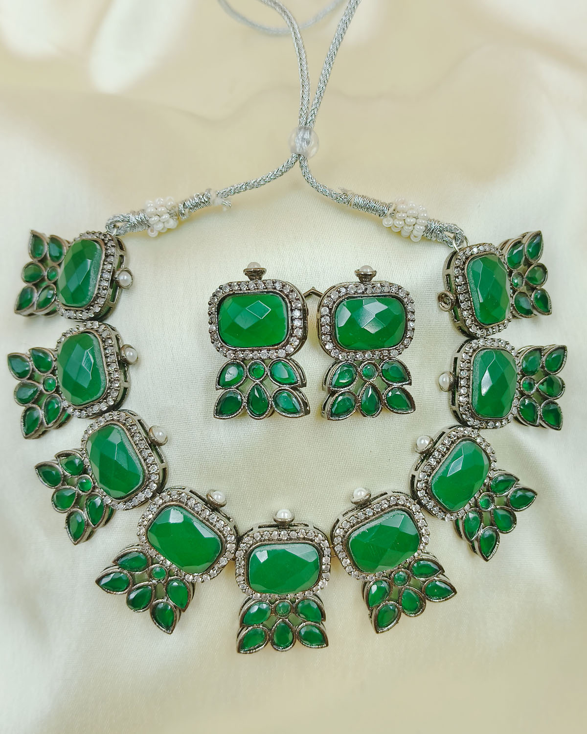 Green AD Stone Choker Necklace Earring Set Adjustable High Neck American Diamond Monalisa Stone Necklaces