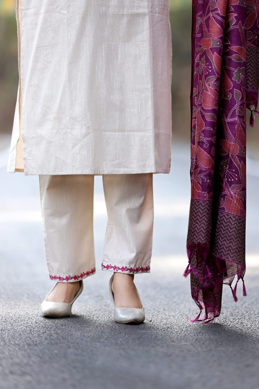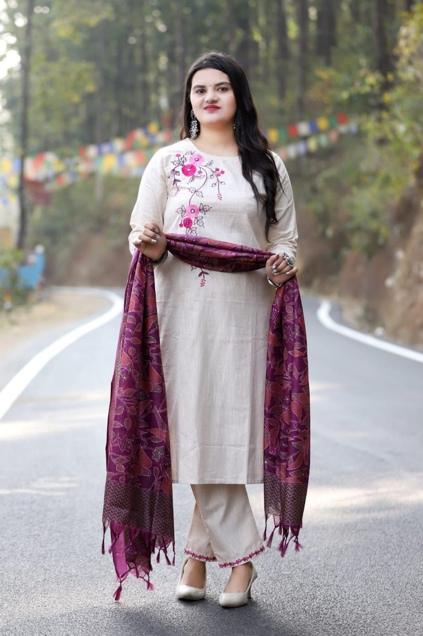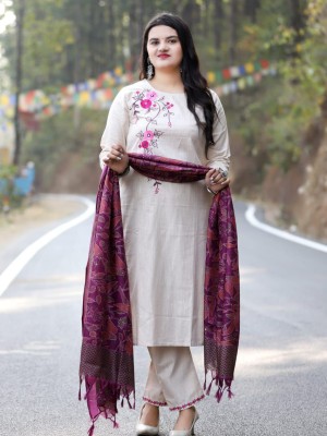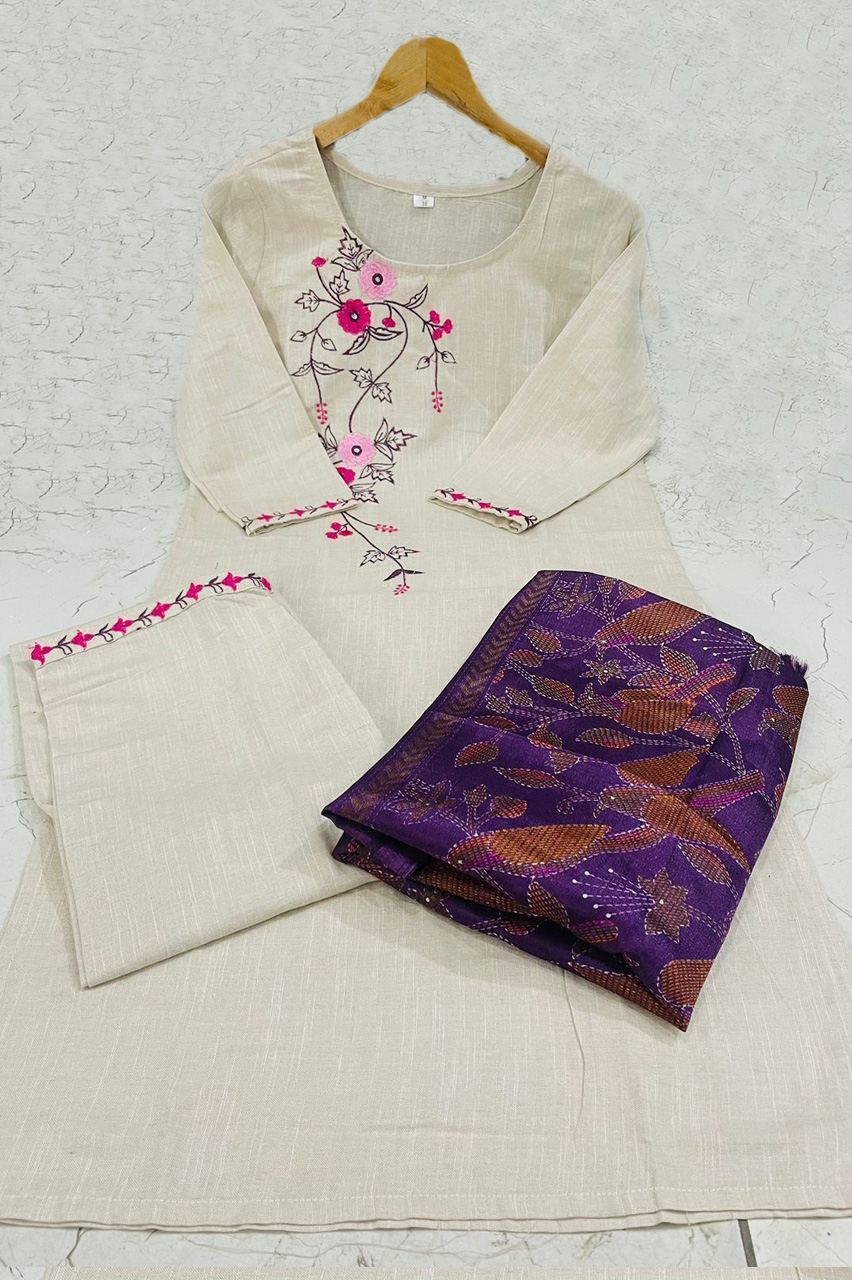 Beige South Cotton Embroidered Kurti Pant Dupatta Salwar Kameez Suit