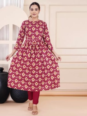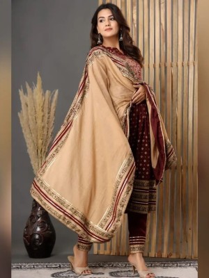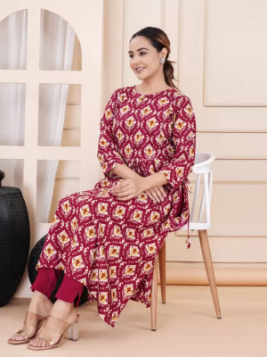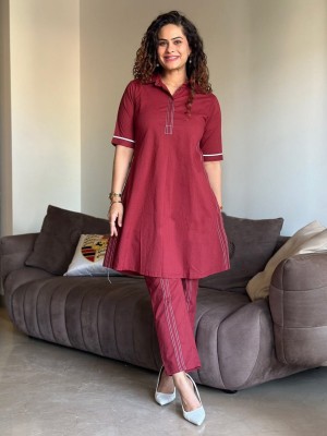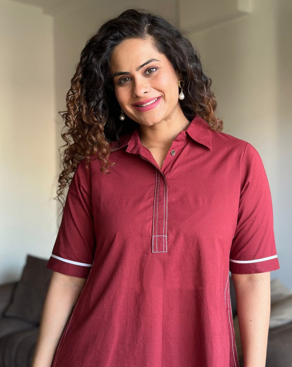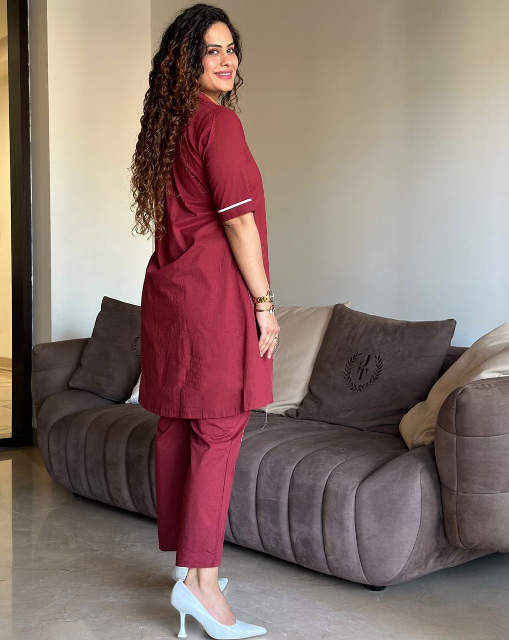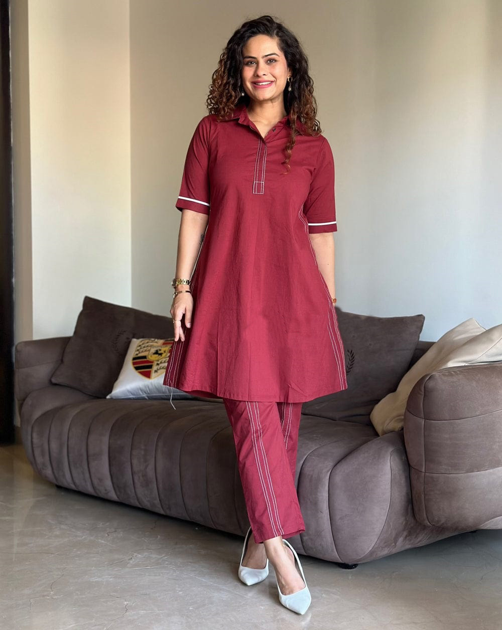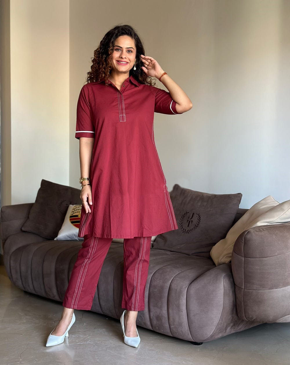 Maroon Collared Cotton Indian Pakistani Co-Ord Set Readymade Matching Shalwar Kameez Kurti with Ankle Length Pant