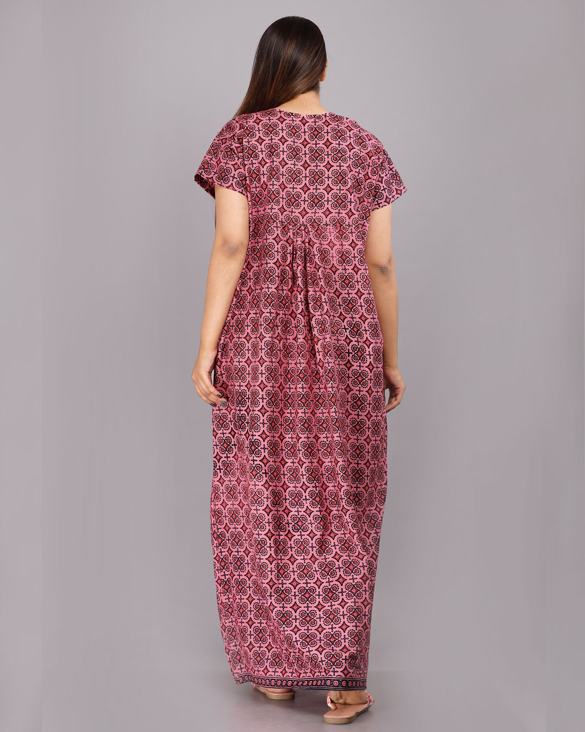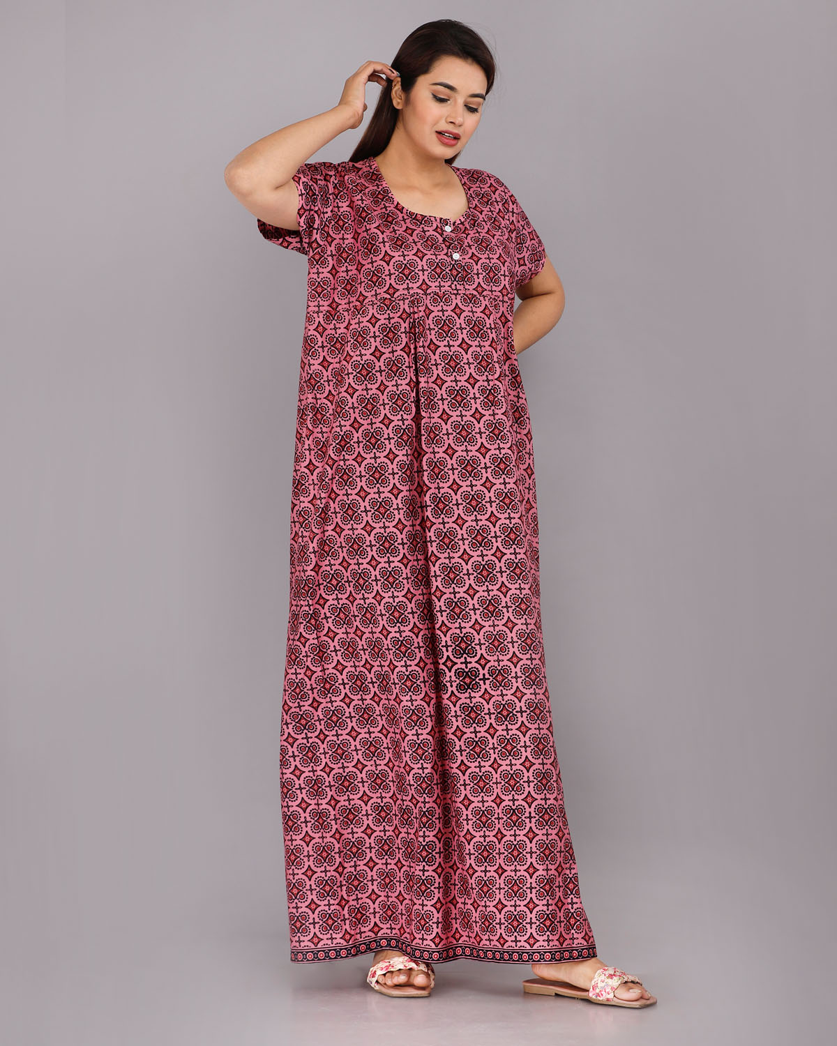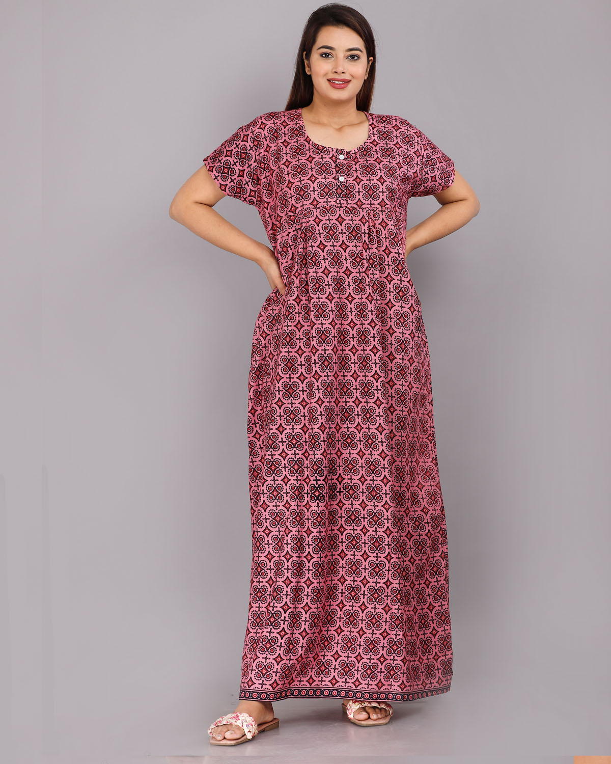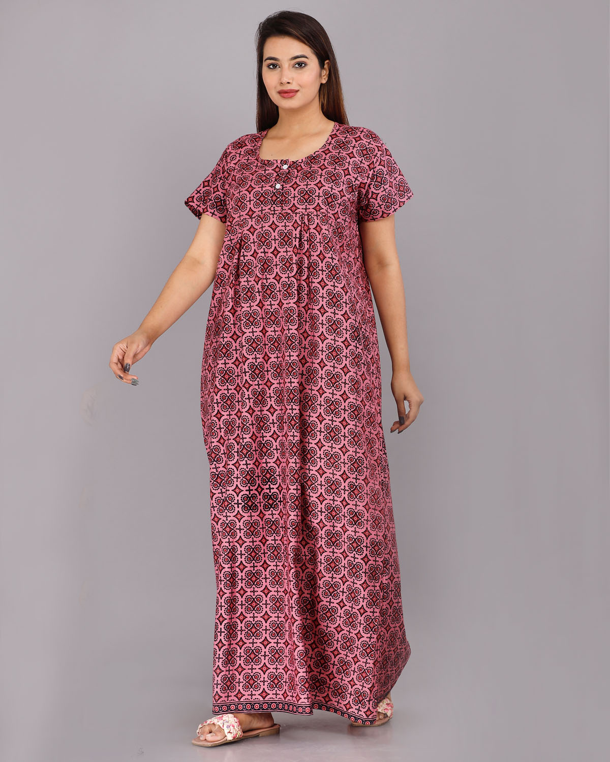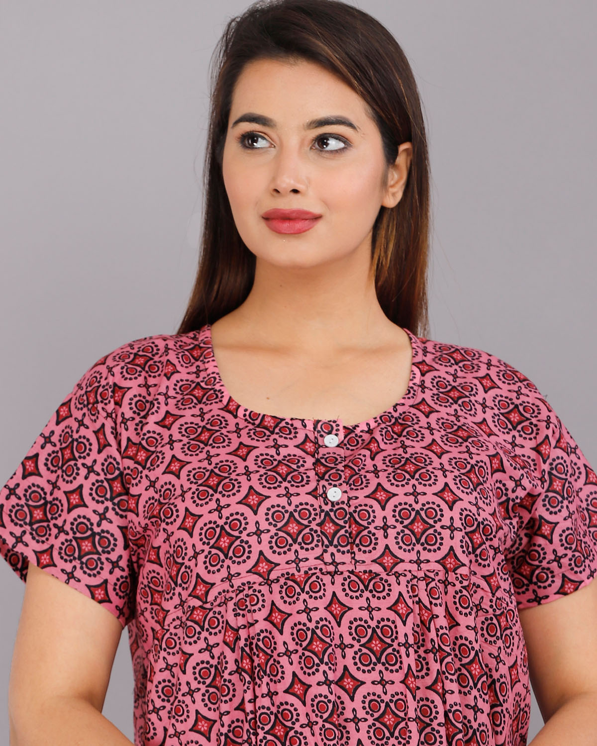 Pink Cotton Night Nighty Gown Dress Comfortable Wear Star Printed Kurti Gown with Two Button