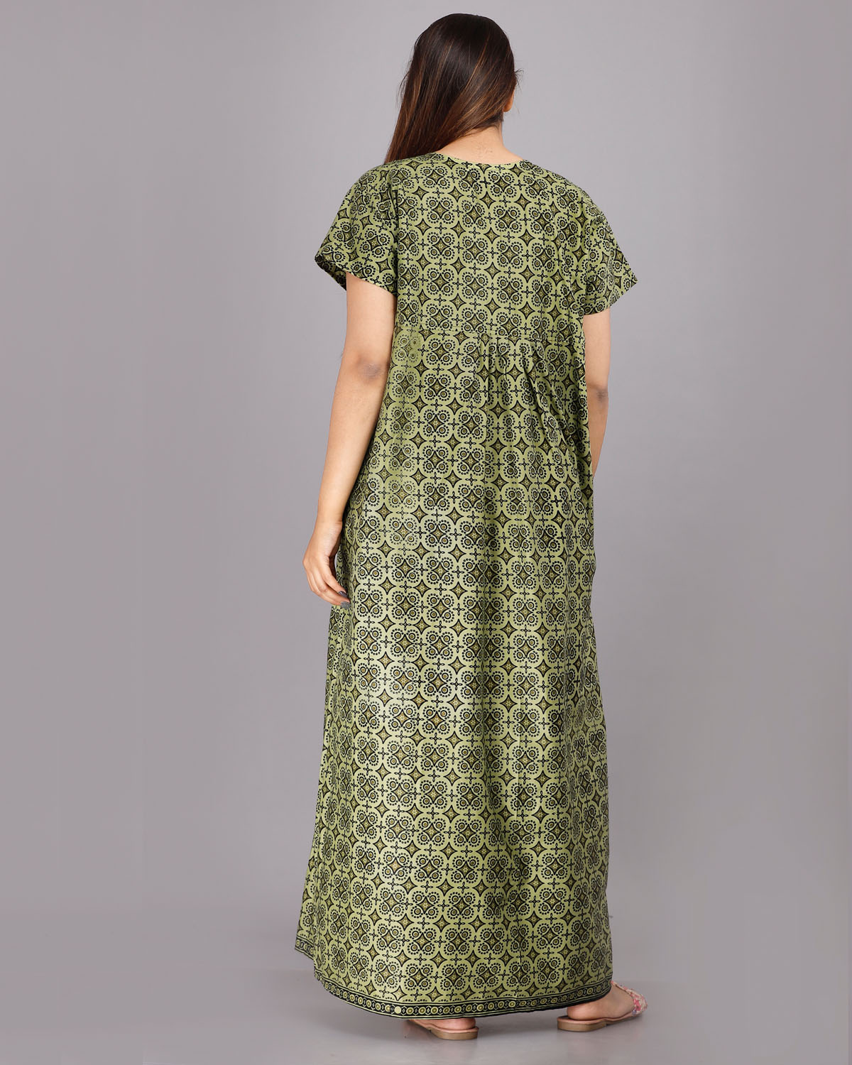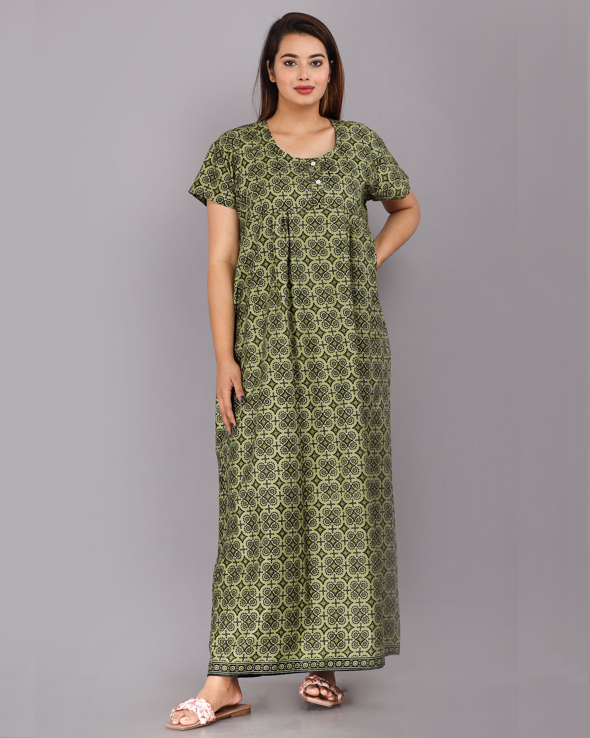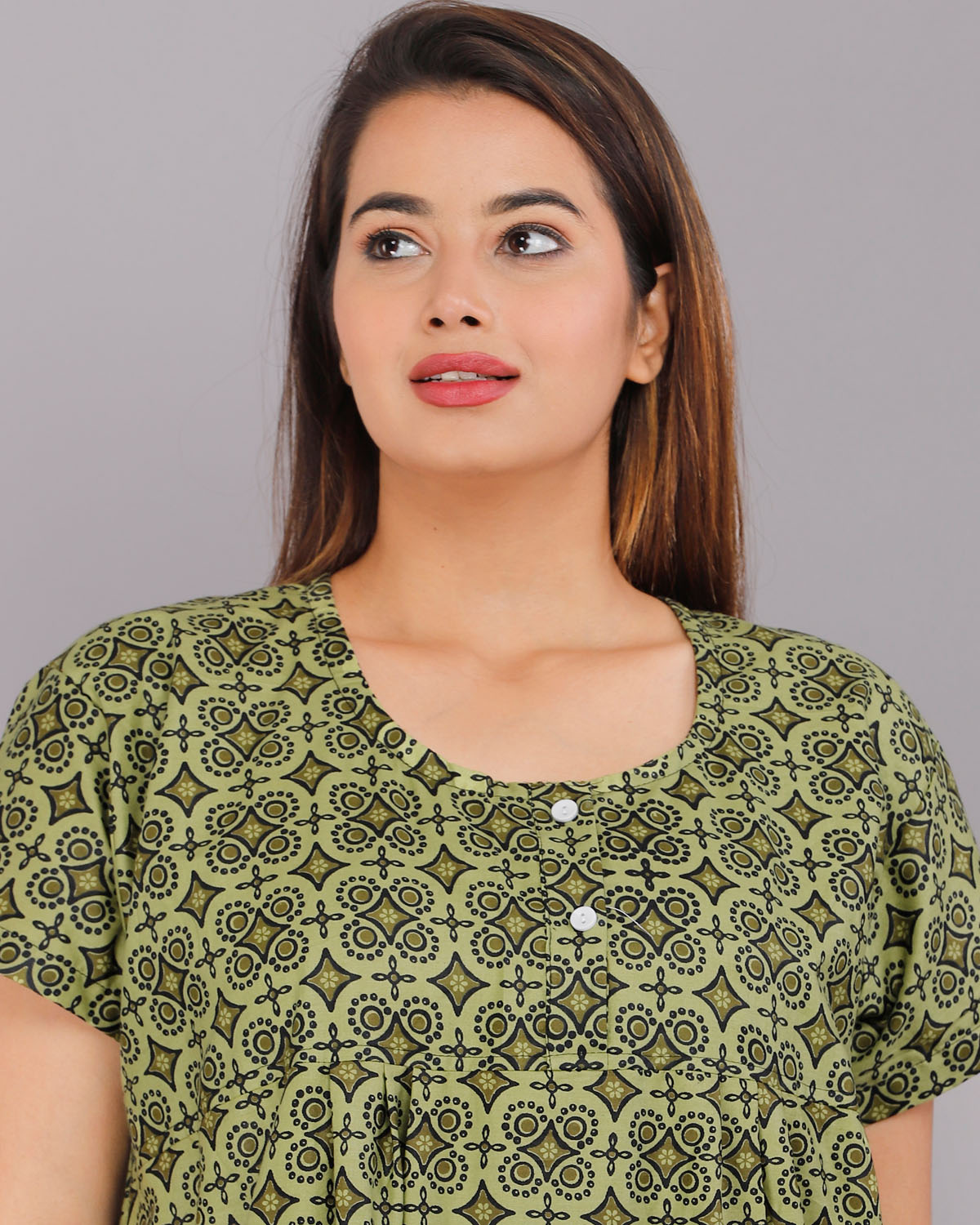 Olive Green Cotton Night Nighty Gown Dress Comfortable Wear Star Printed Kurti Gown with Two Button