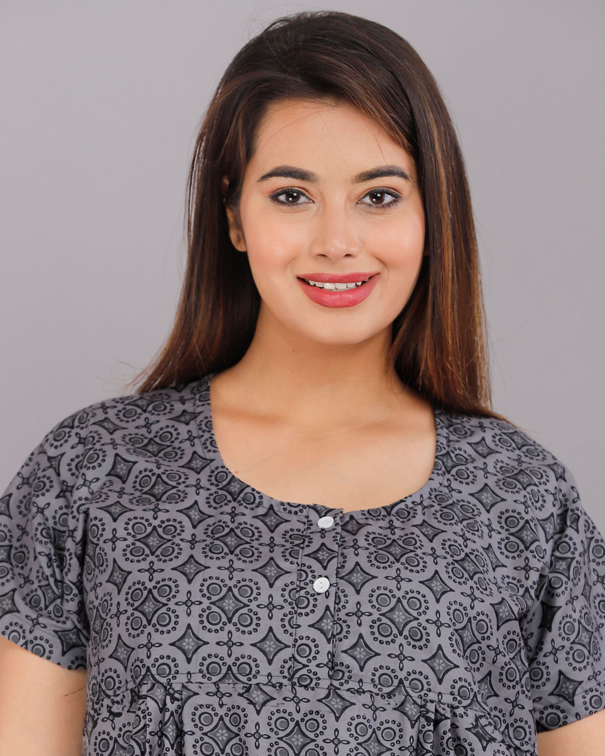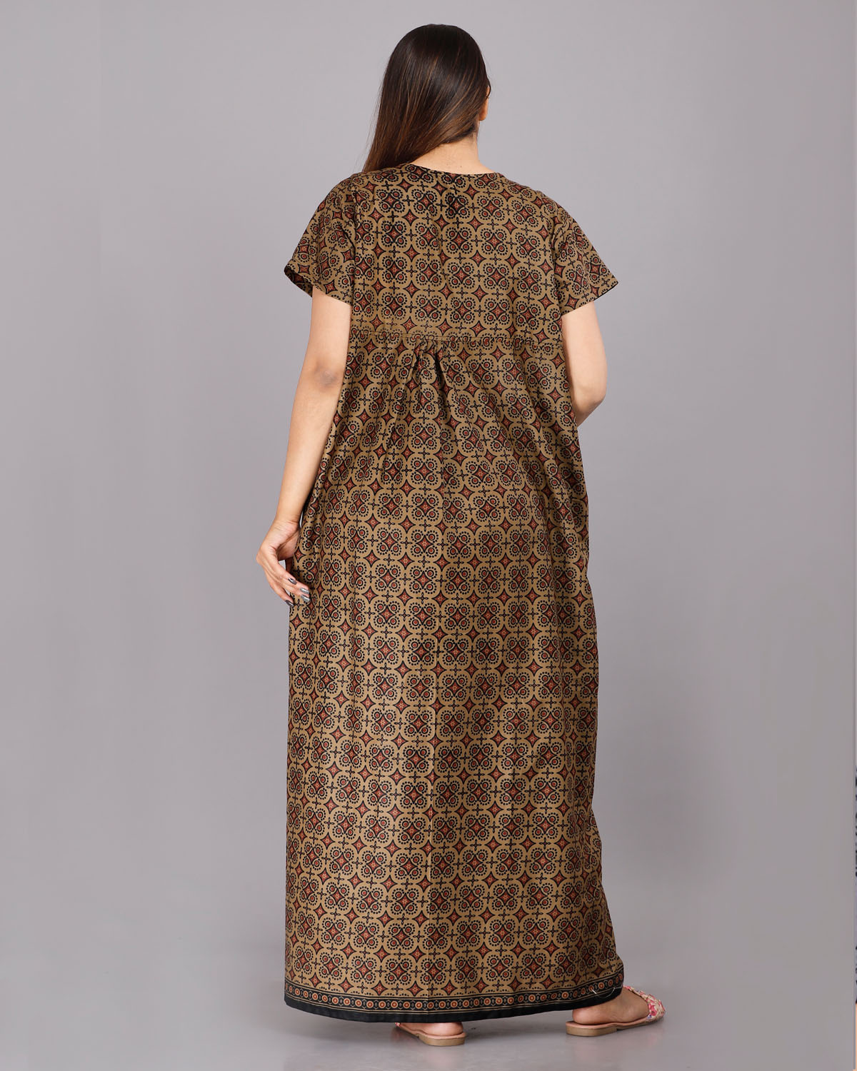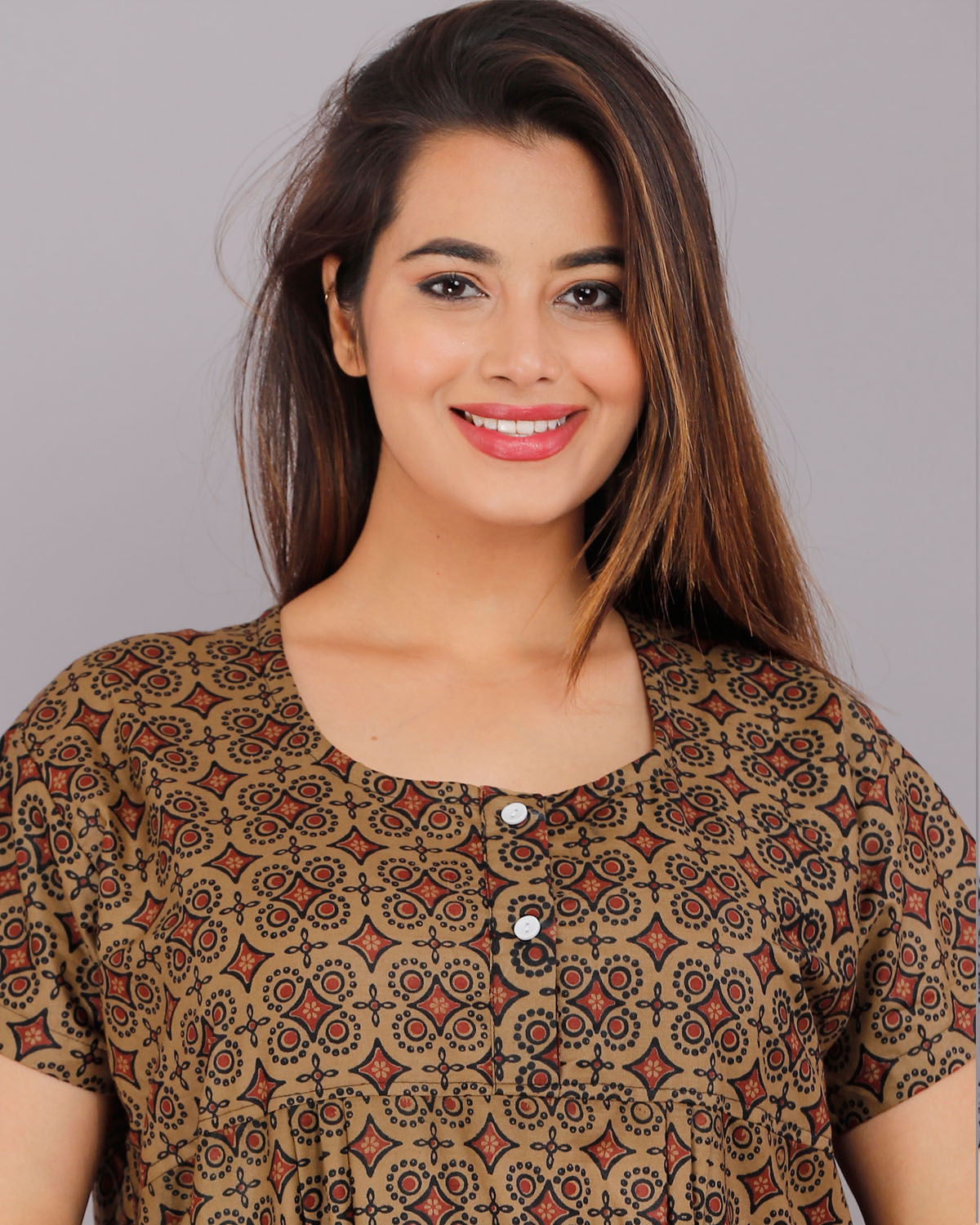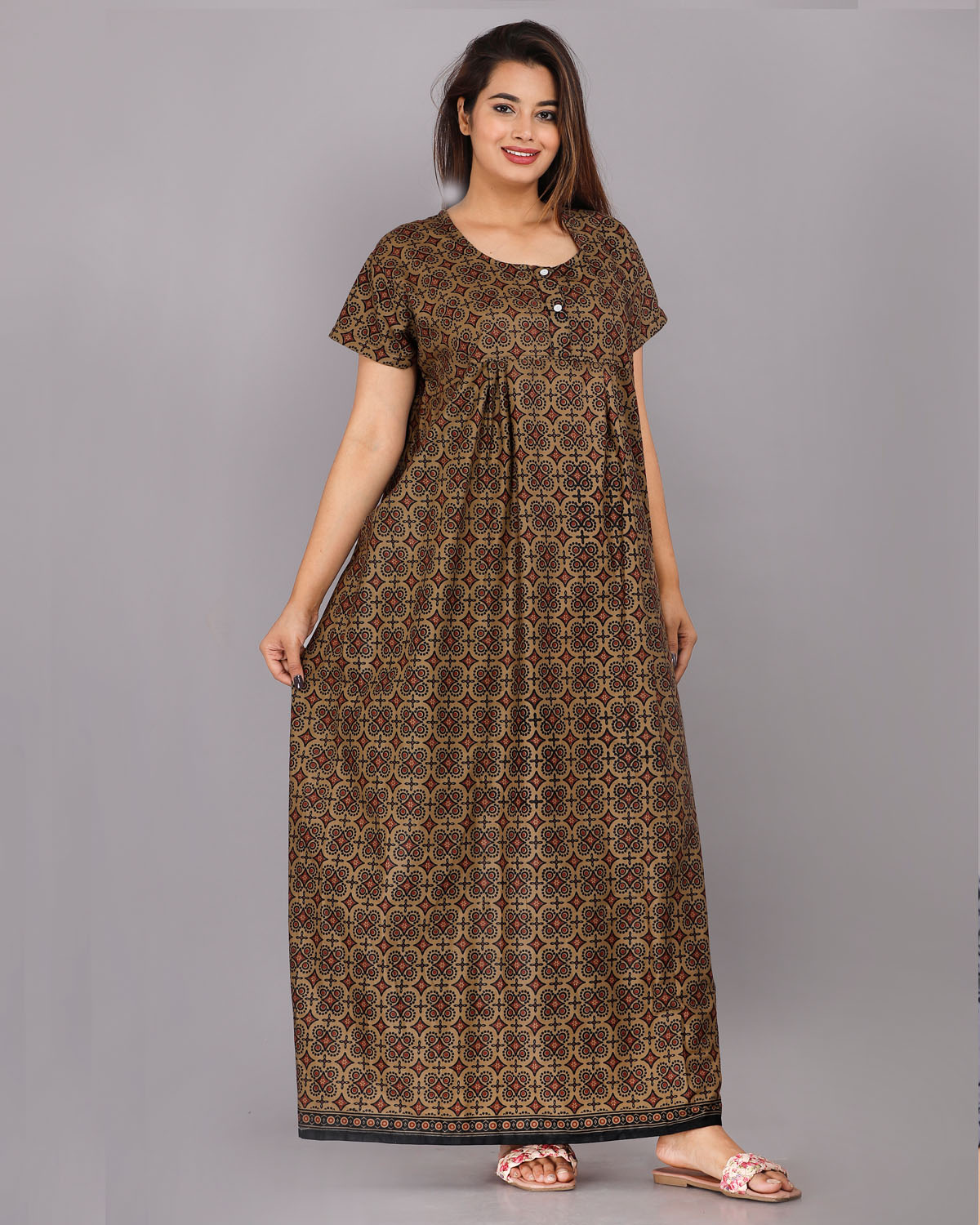 Brown Cotton Night Nighty Gown Dress Comfortable Wear Star Printed Kurti Gown with Two Button