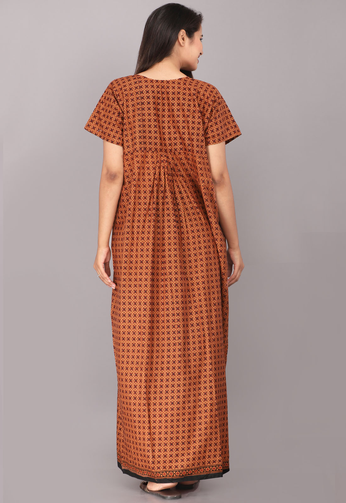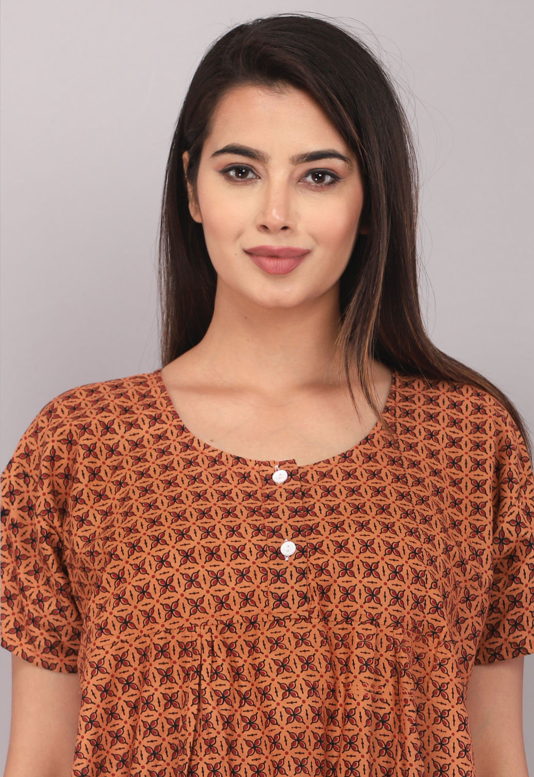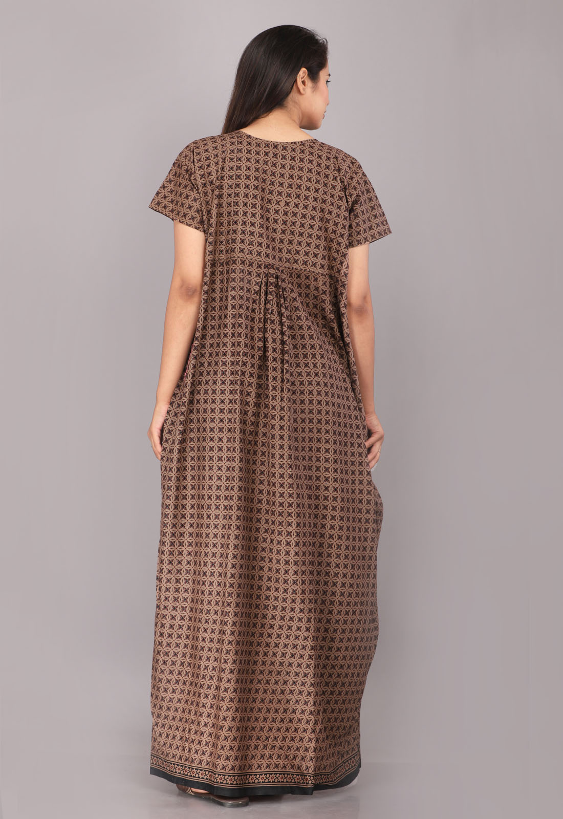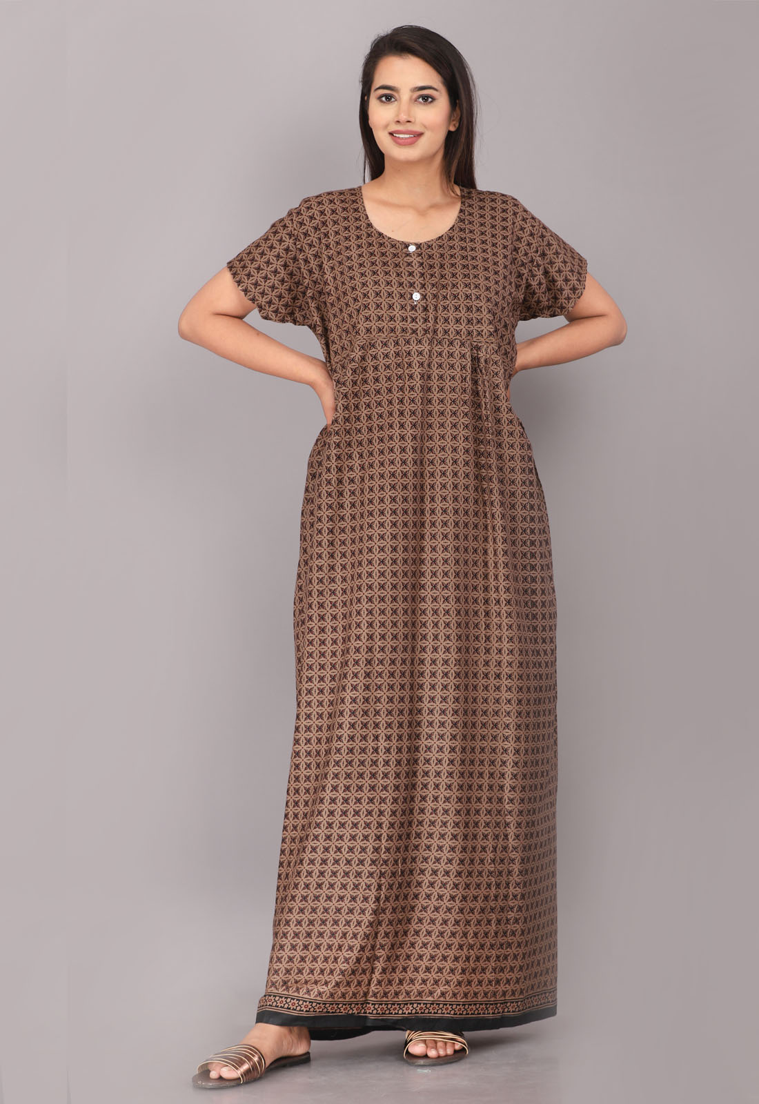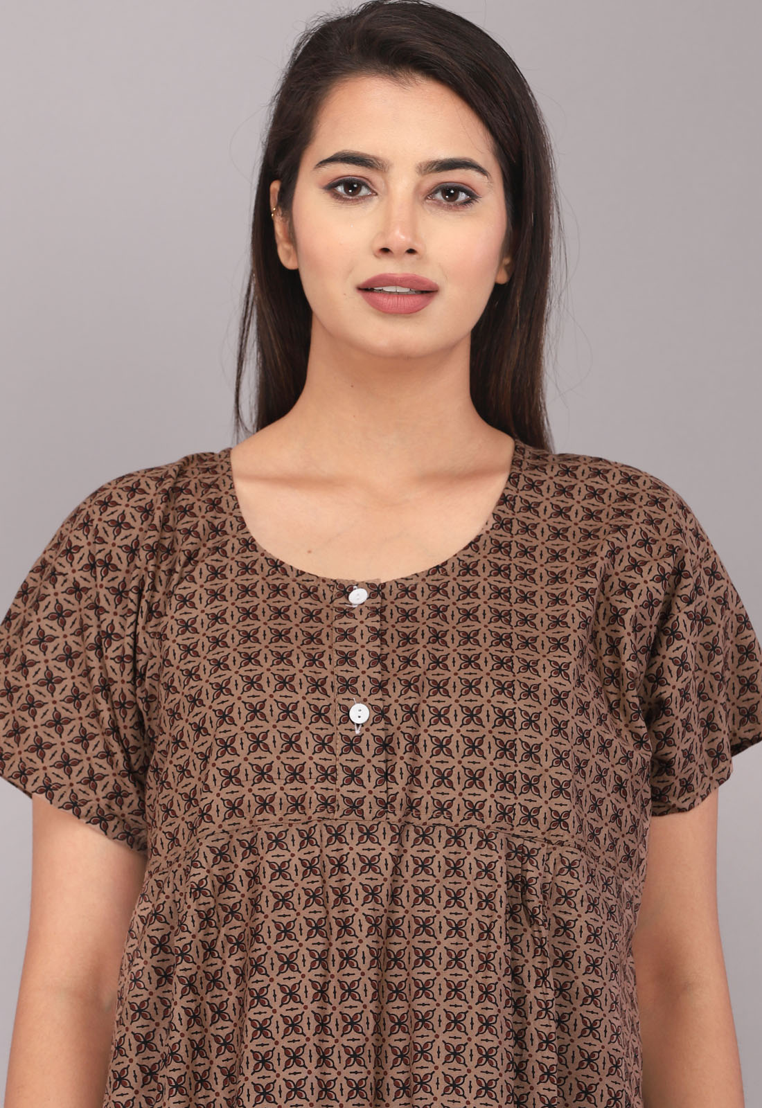 Brown Daily Wear Nighty Gown Cotton Printed Casual Night Dress Kurti Gown with Two Button
