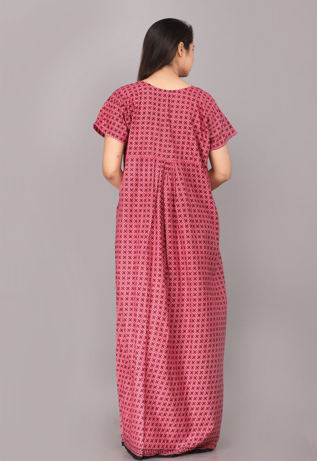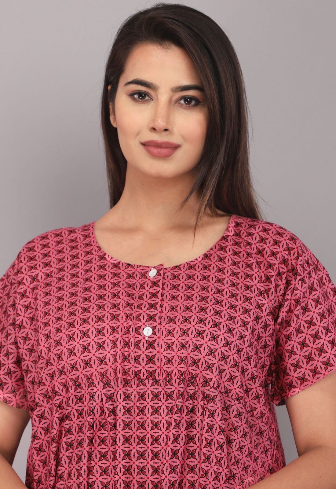 Pink Daily Wear Nighty Gown Cotton Printed Casual Night Dress Kurti Gown with Two Button