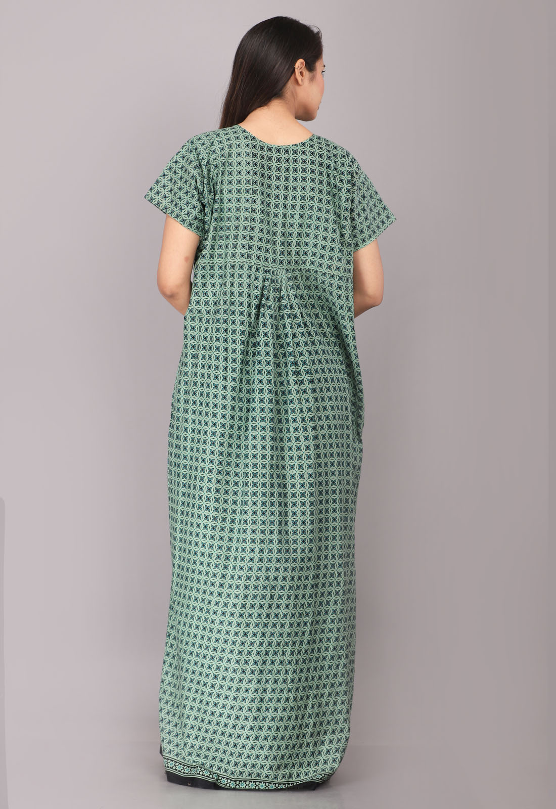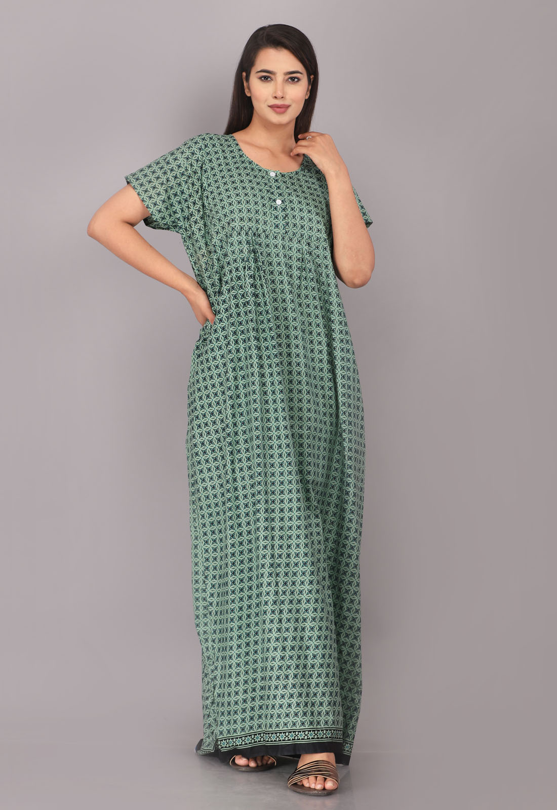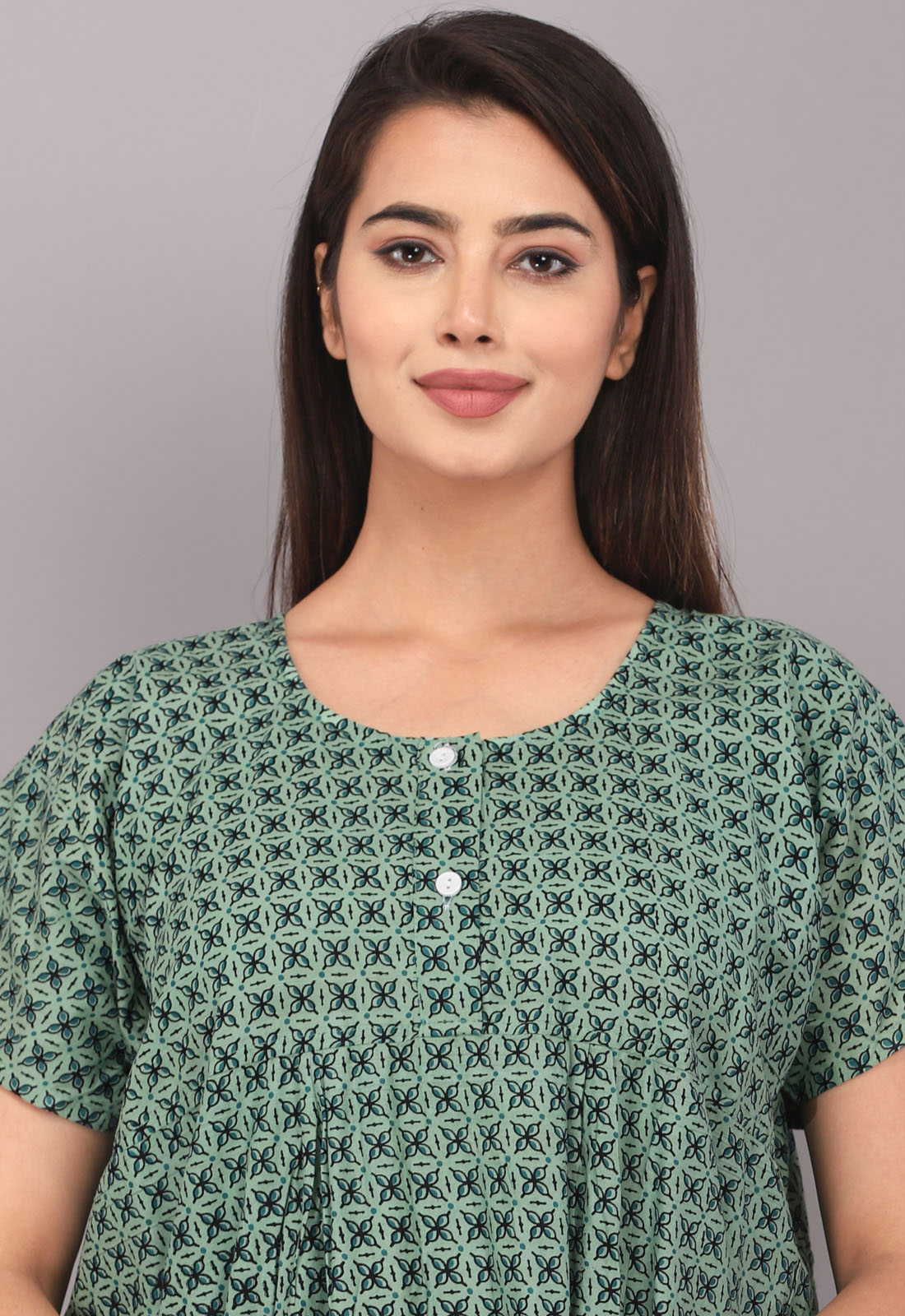 Green Daily Wear Nighty Gown Cotton Printed Casual Night Dress Kurti Gown with Two Button