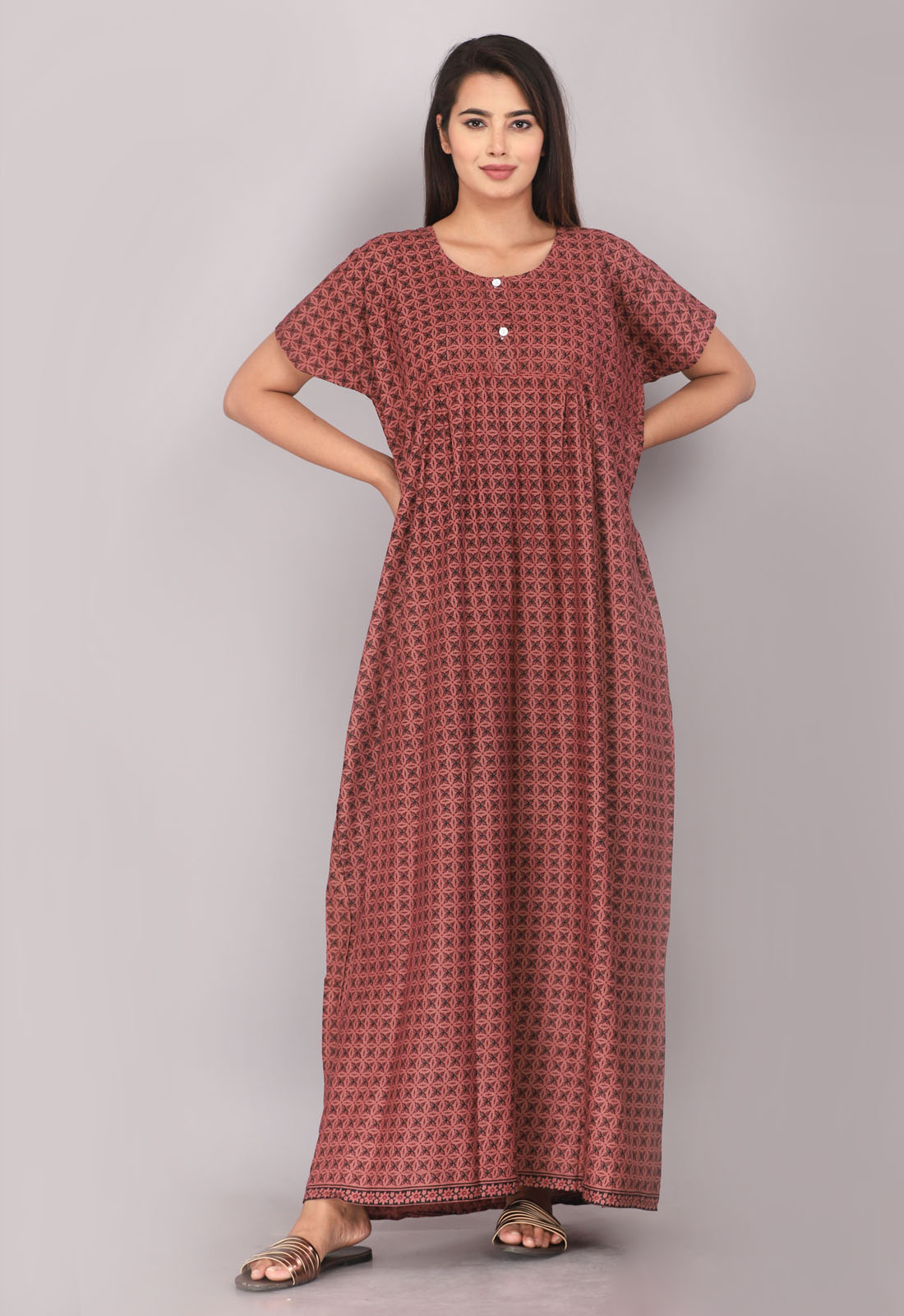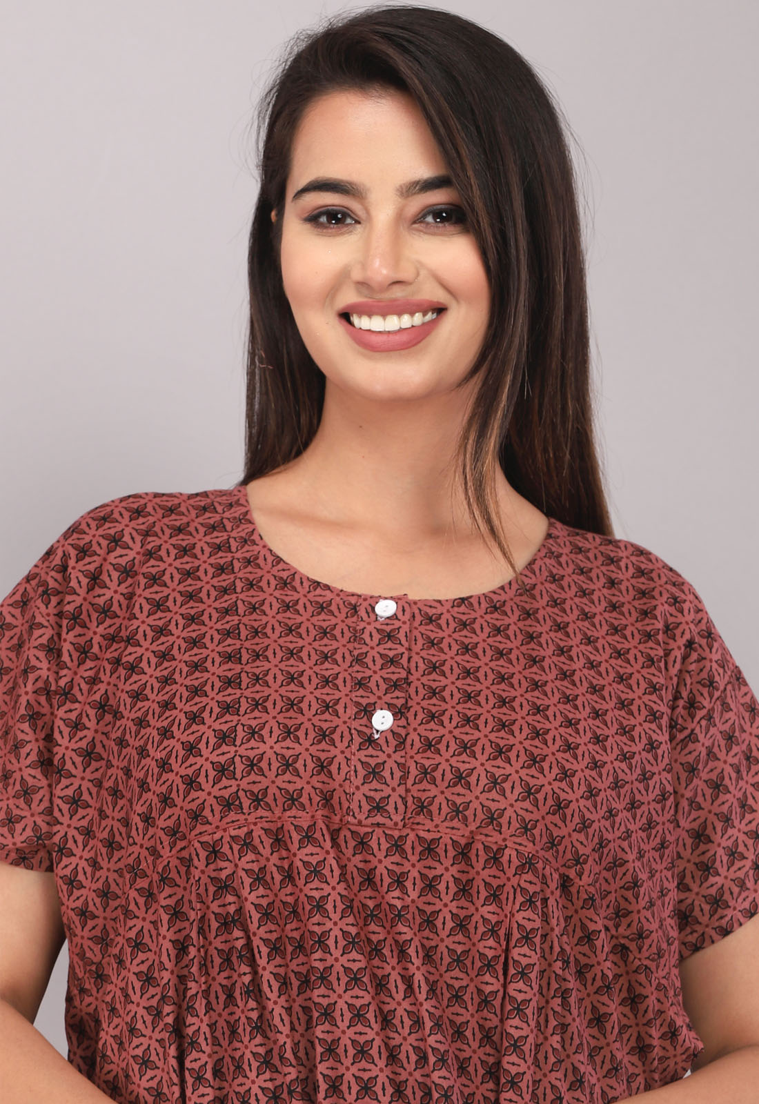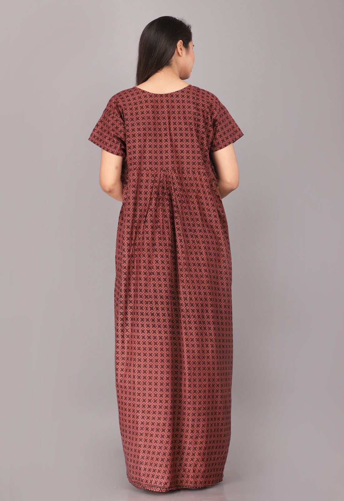 Maroon Daily Wear Nighty Gown Cotton Printed Casual Night Dress Kurti Gown with Two Button