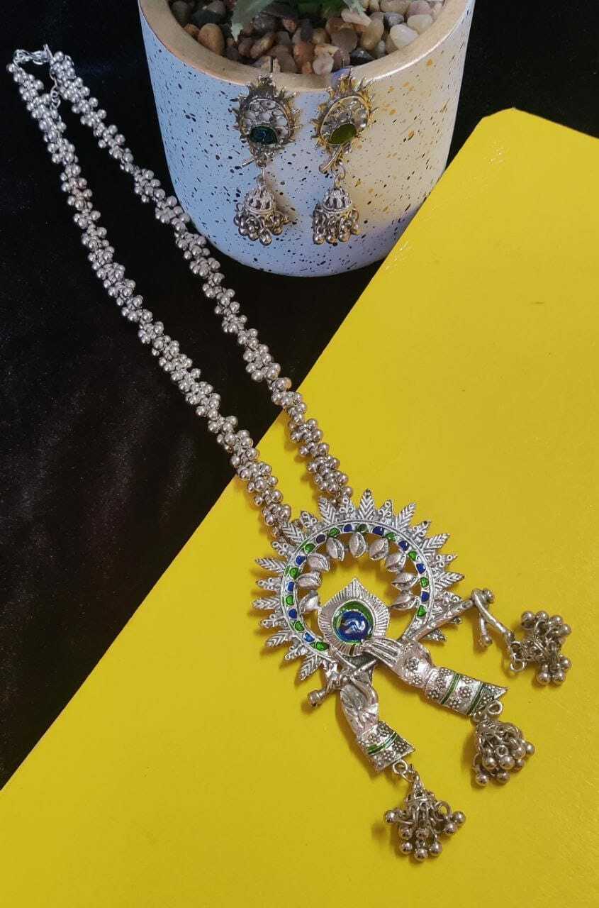 Krishna Flute Oxidized Necklace Afghani Bohemian German Silver Long Necklace Set