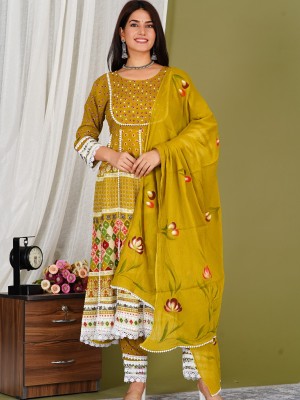 Mustard Yellow Indian Frock Style Floral Anarkali Salwar Kameez Kurti Pant Dupatta Set Online